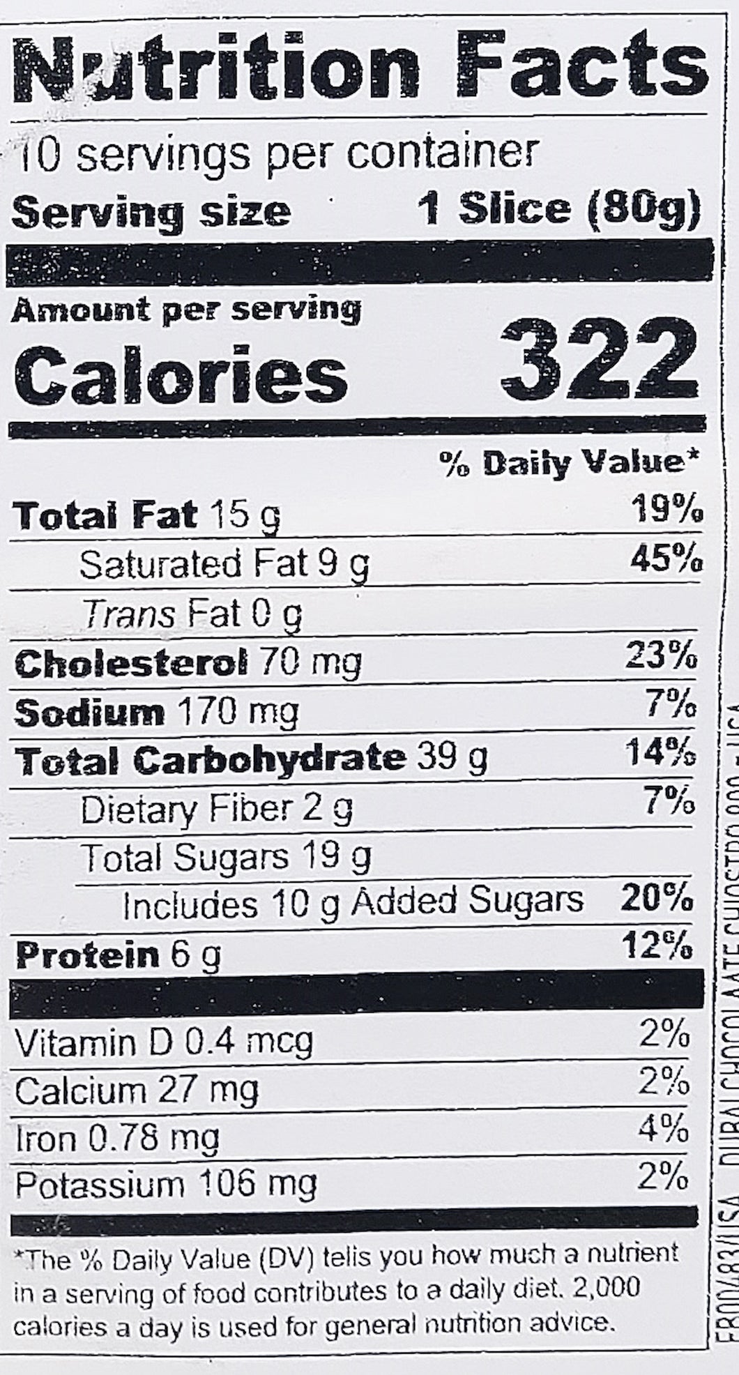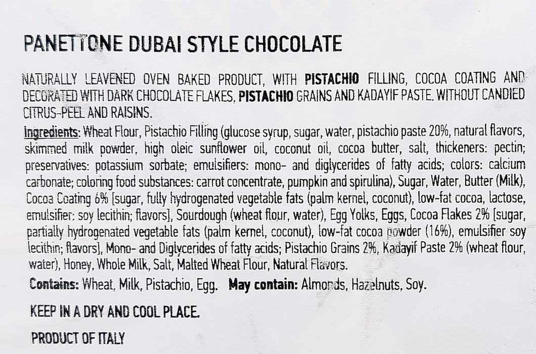 Ingredients: WHEAT flour, PISTACHIO filling (glucose syrup, sugar, water, PISTACHIO paste 20%, natural flavors, skimmed MILK powder, high oleic sunflower oil, coconut oil, cocoa butter, salt, thickeners: pectin; preservatives: potassium sorbate; emulsifiers: mono- and diglycerides of fatty acids; colors: calcium carbonate; coloring food substances: carrot concentrate, pumpkin and spirulina), sugar, water, BUTTER (MILK), cocoa coating 6% (sugar, emulsifier: fully hydrogenated vegetable fats (palm kernel, coconut), low-fat cocoa, LACTOSE (MILK), emulsifier: SOY lecithin; flavors), natural yeast (WHEAT) 5%, EGG yolks, EGGS, dark chocolate flakes 2% (sugar, emulsifier: partially hydrogenated vegetable fats (palm kernel, coconut), low-fat cocoa powder (16%), emulsifier SOY lecithin; flavors), emulsifiers: mono- and diglycerides of fatty acids; PISTACHIO grains 2%, kadayif paste 2% (WHEAT flour, water), Millefiori honey, whole MILK, salt, malted WHEAT flour, natural flavors.