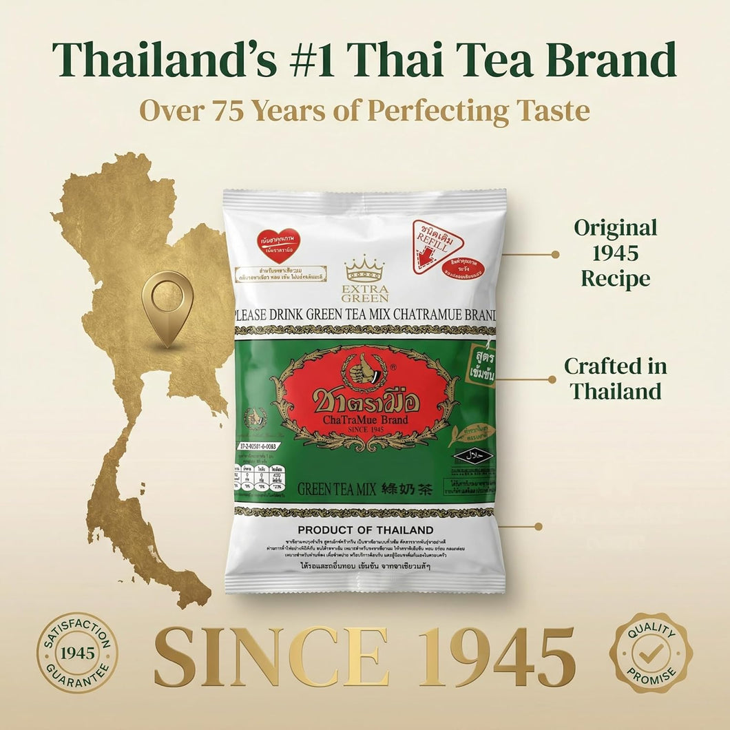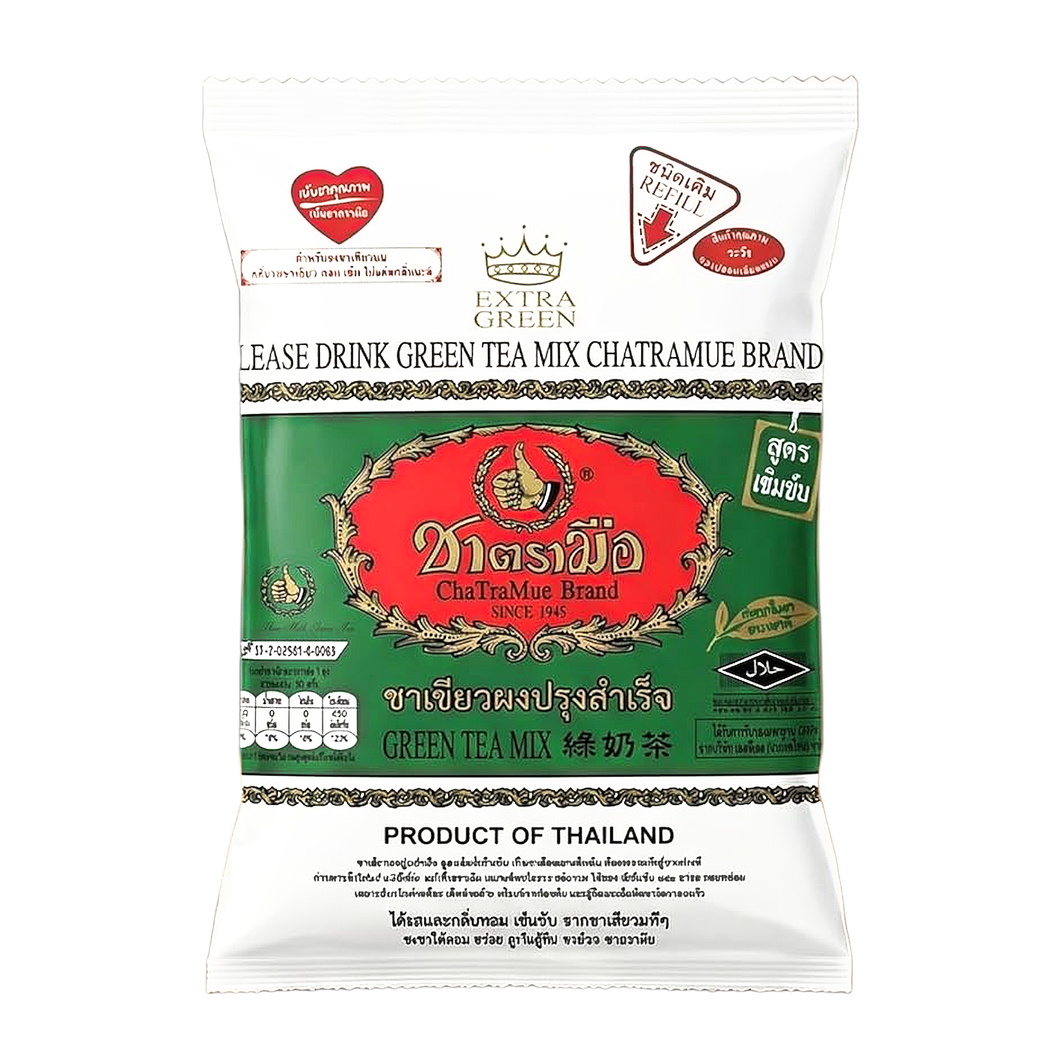 ChaTraMue Green Tea mix is exclusively grown and harvested from the cool mountainous northern region of Thailand. Traditionally picked by skilled hands and blended by ChaTraMue's tea masters, the tea releases an elegant jasmine aroma along with a sweet taste and pleasant flavor. The tea has a fragrance resemblance of Thai Jasmine Tea.