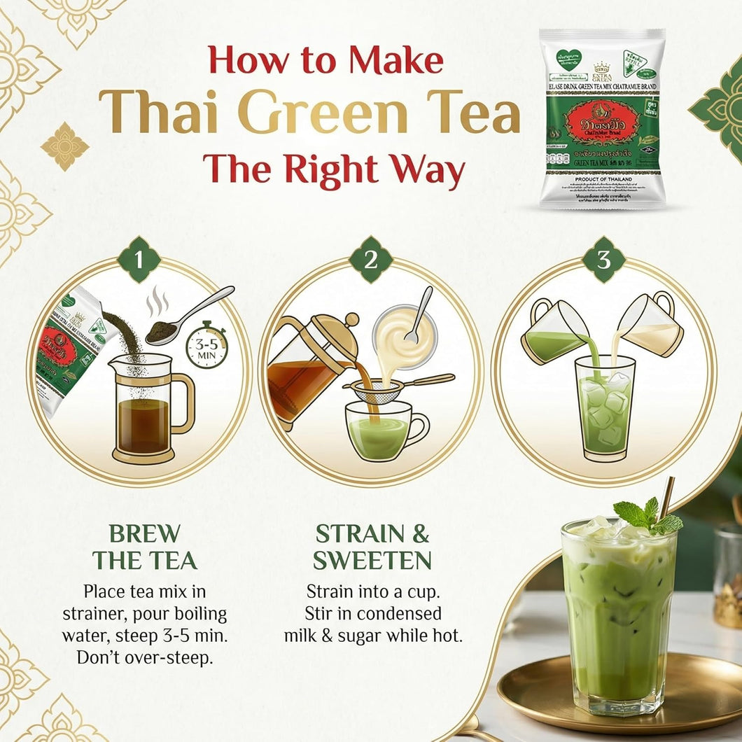 ChaTraMue Green Tea is best served with milk that can be served hot or cold. It makes delicious Milk Tea or add boba tapioca pearls for Boba Milk Tea. It can also be used as ice cream flavor, confectioneries, and sweets.