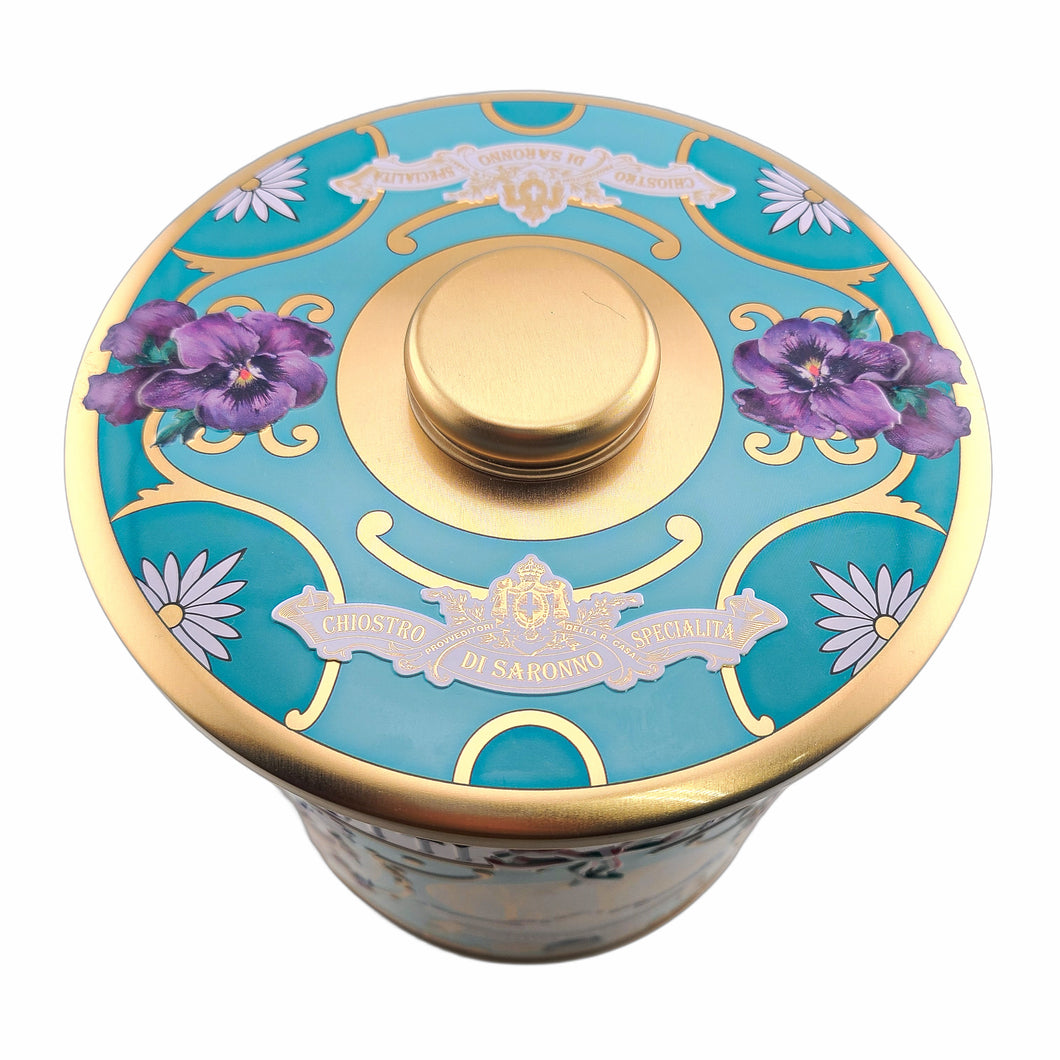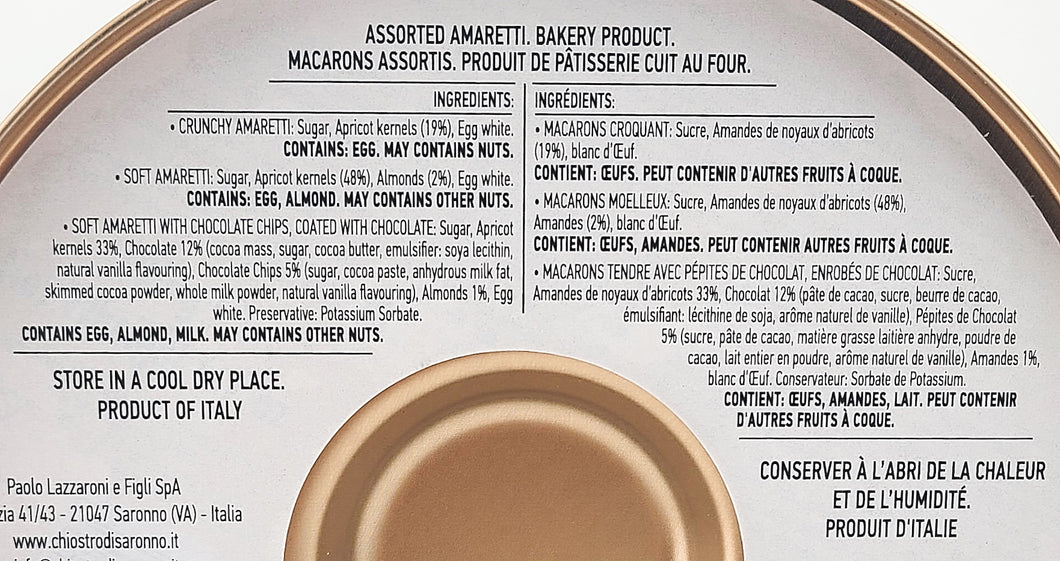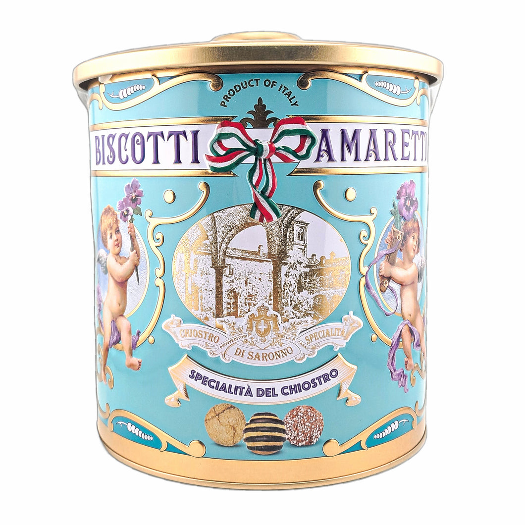 Exquisite Chiostro di Saronno embossed gift tin's design inspired by the company's historical archive, in intricate details. It is filled with traditional amaretti in 3 assorted flavors: Crunchy Amaretti, Soft Amaretti, and Soft Amaretti with Chocolate Chips. Each of these delicious amaretti cookies is individually wrapped for hygiene and freshness, and the colorful signature wrappers make a wonderful display. When you have eaten all the cookies, you can keep the tin as a decorative storage container for your home or a cookie jar. The tin is collectible. The cookies are Gluten-free.