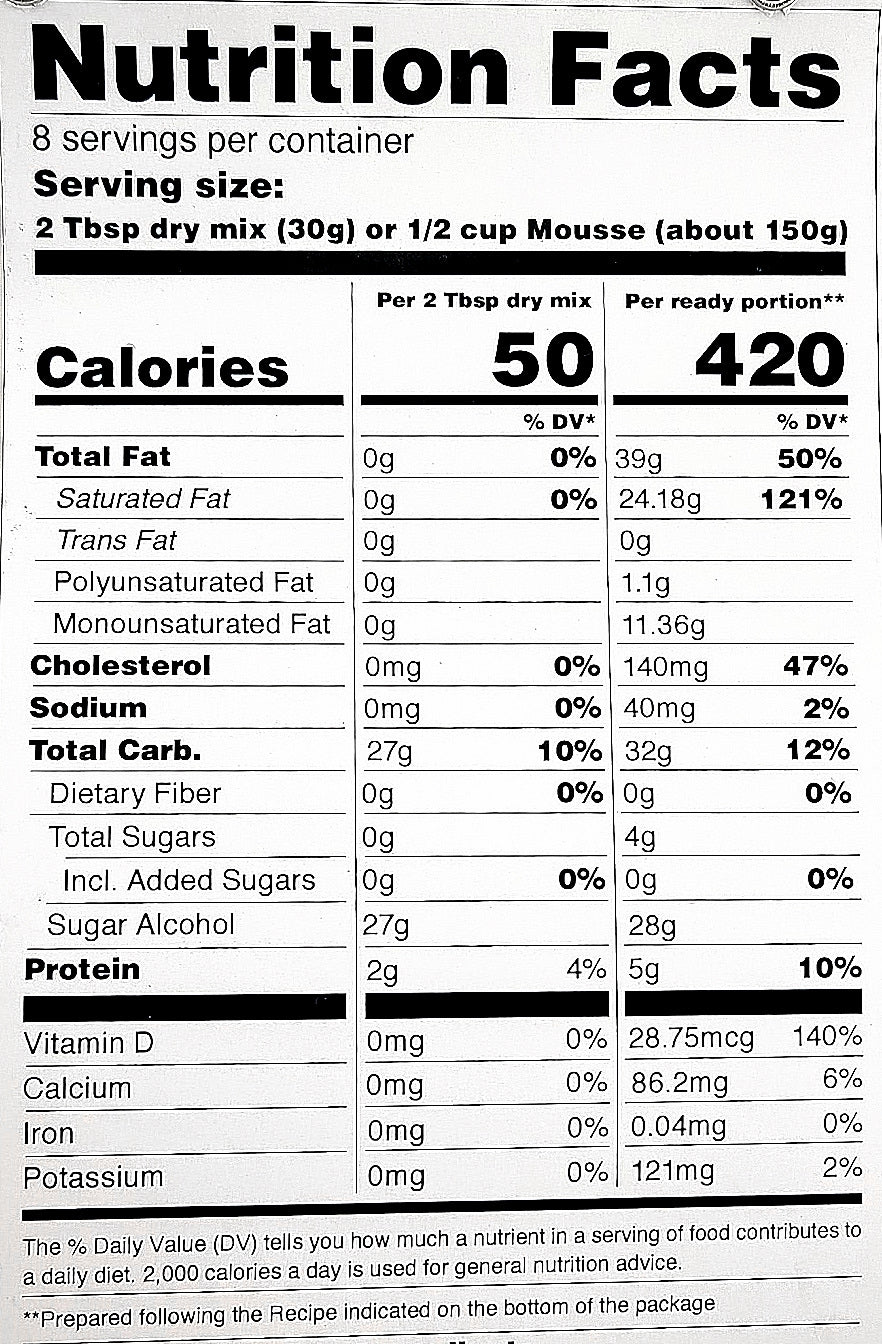 Directions: Pour 250g of Mousse Mix into a bowl and add the room temperature fresh cream. Stir with an electric whisk for a few minutes to obtain an airy and soft structure. You may add any other desired flavoring to the mousse. Pour the mousse into a cup or glass and put in the refrigerator for at least 2 hours before serving.