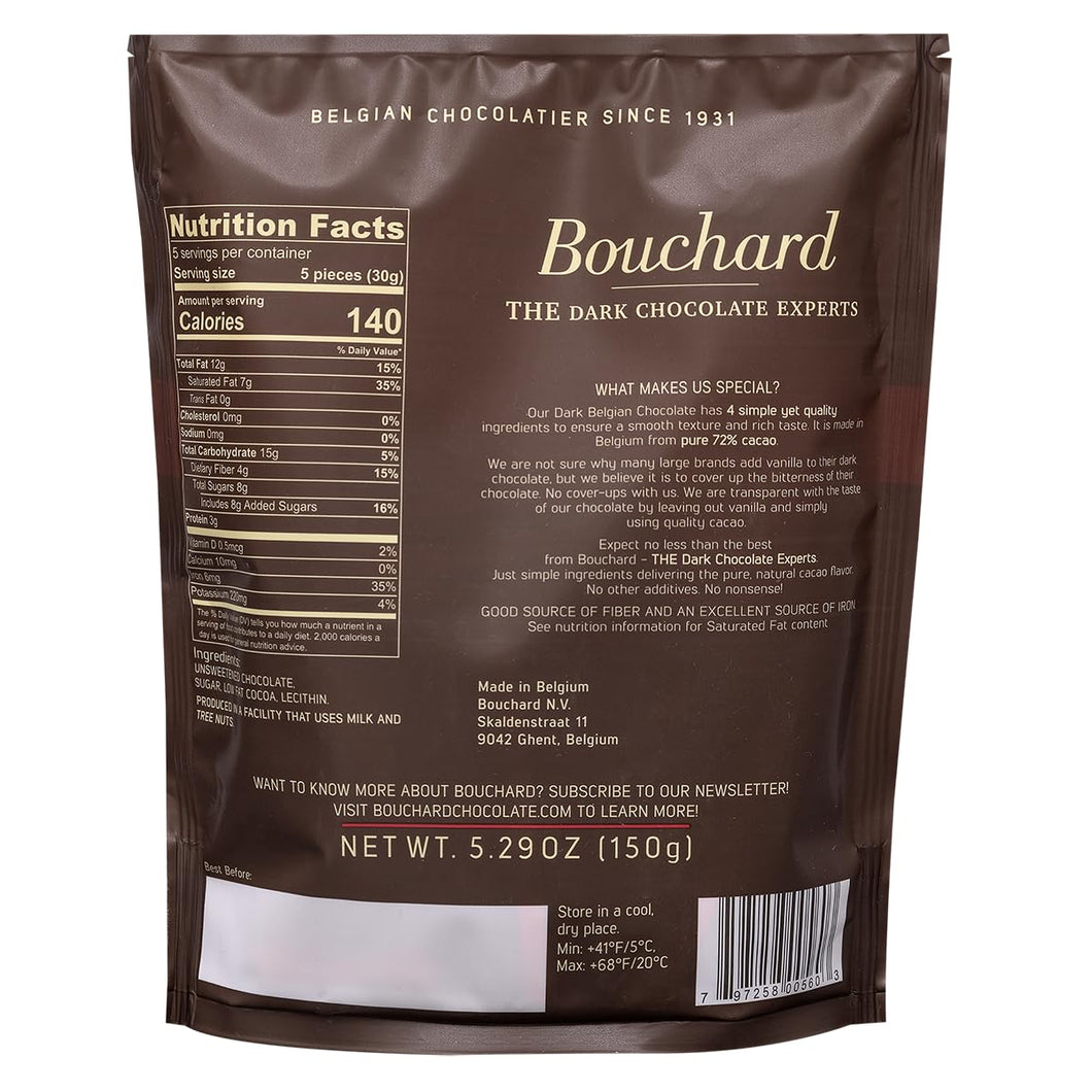 Every bite is a treat and takes you on a journey through the Belgian experience. Bouchard's rich dark chocolates have a natural, luxuriously deep color, give you satisfying melting moments that last, and offer a special smooth touch with fine ridges, giving you the intense burst of flavor you are looking for. Each bite-sized piece is individually wrapped.