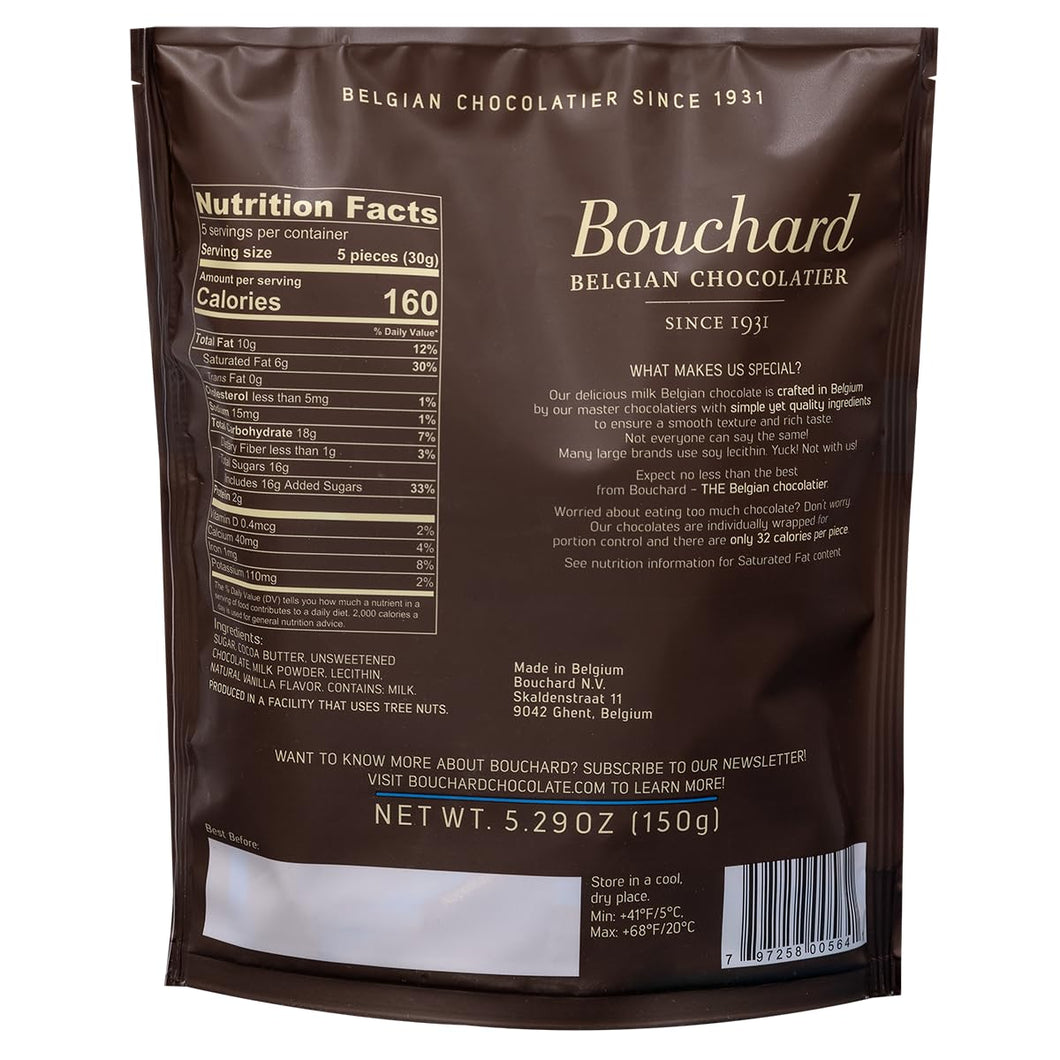 A creamy Belgian dream! Why we all love Belgian Milk Chocolate: The chocolate flavor is intensely rich and allows you to feel the combination of the different carefully selected ingredients. Bouchard's Belgian Milk Chocolate is delicious, creamy, and of premium quality. Each bite-sized piece is individually wrapped. No soy, non-GMO, and gluten-free.