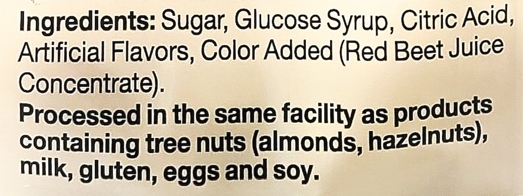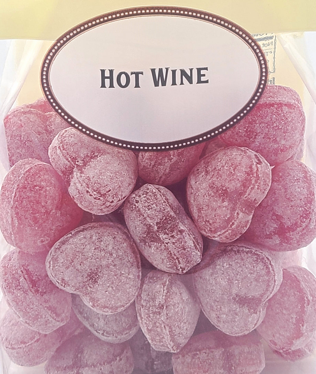 This Hot Wine hard candy is heart-shaped, making it a perfect gift for Valentine's Day. Red color is from red beet juice concentrate.