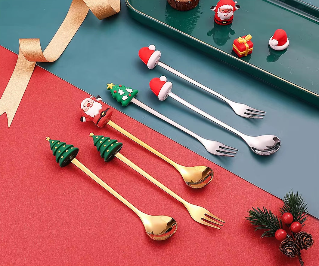Our 6-piece silverware Christmas coffee stirring spoon, a perfect addition to your holiday decorations. Each spoon comes with an adorable Christmas theme ornament on top in 6 different designs; Santa Claus, 2 designs of Christmas Tree, Reindeer, Snowman, and Santa Hat, making them a great silverware for the holiday season.