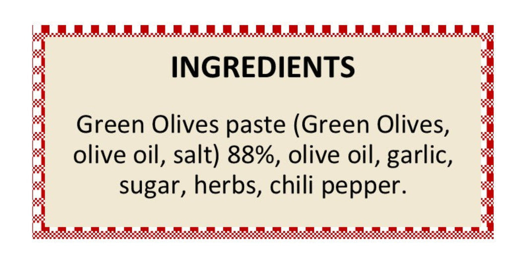 • Green Olives Tapenade:  Made of green olive paste preserved in olive oil with garlic, chili pepper, and herbs, ideal with smoked salmon. Whether used to make delicious canapés straight out of the jar or combined with other ingredients for casseroles or salad dressing, this tapenade will pack a powerful flavor into any dish..  No preservatives or colors added, and gluten-free.