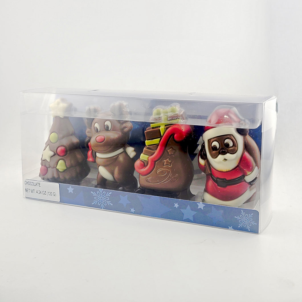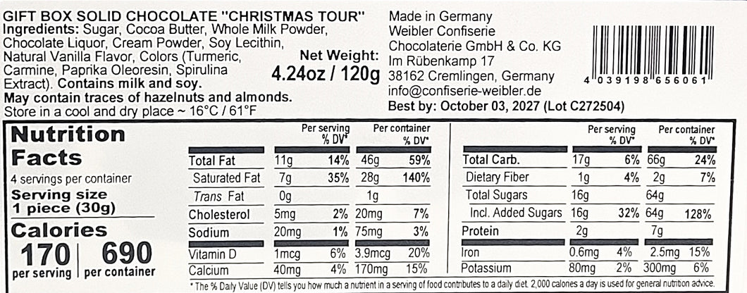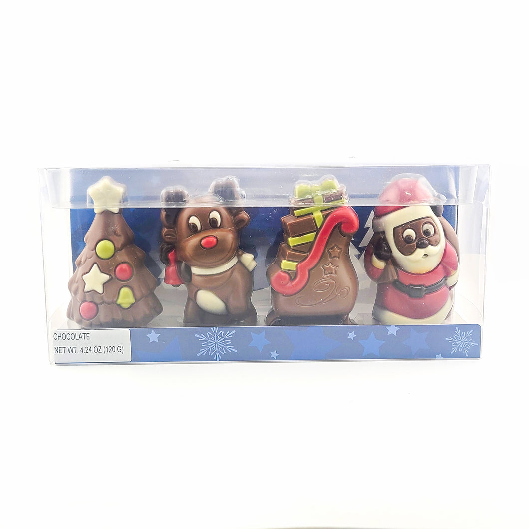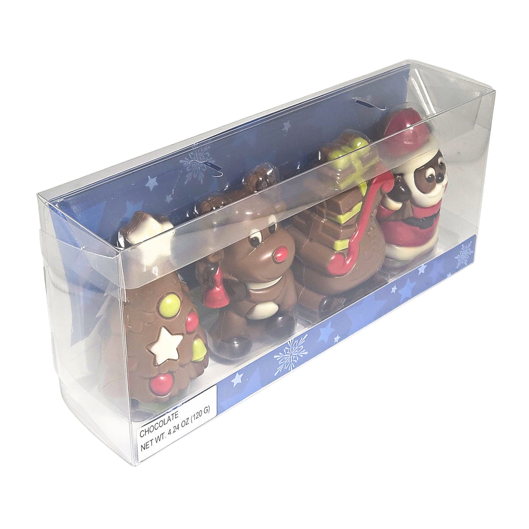 This Weibler "Christmas Tour" gift box celebrates the spirit of Christmas Eve and Christmas for all young and old.  It contains hollow chocolate figures of Santa Claus, Rudolph Reindeer, Santa's sleigh filled with presents, and a Christmas tree. What a perfect gift!  With its delicious taste and fun design, it will surely put a smile on anyone who receives it.