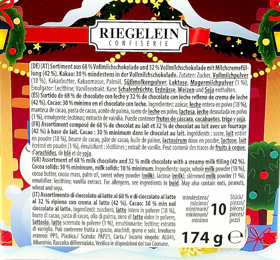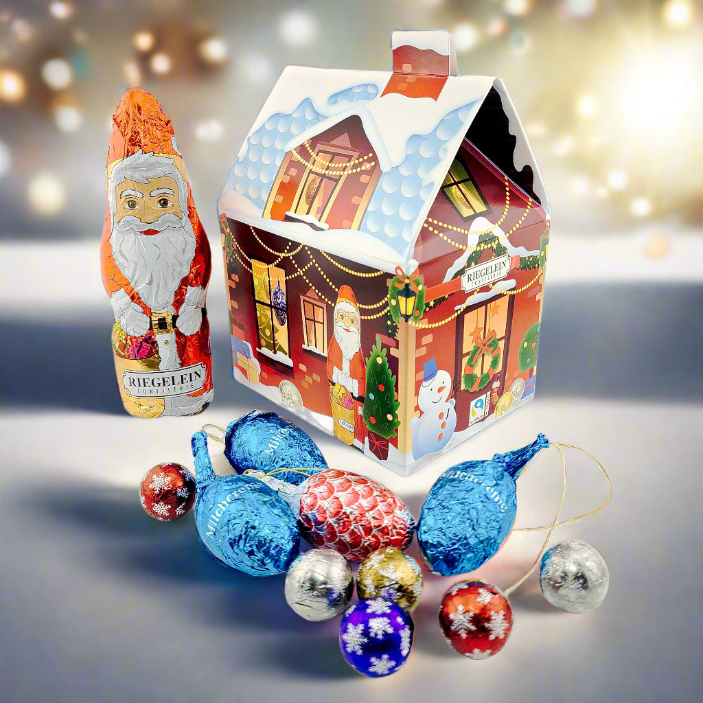 Riegelein Confiserie is one of Europe’s leading chocolate brands, founded in 1953. This festive holiday, Holiday House is filled with Rigelein's assorted chocolate treats, 1 Santa Claus, 4 egg ornaments, and 7 chocolate balls. They are hollow milk chocolates, except for the solid chocolate balls. They are made from the finest German chocolate and Fair Trade. It is a perfect gift for the holidays!
