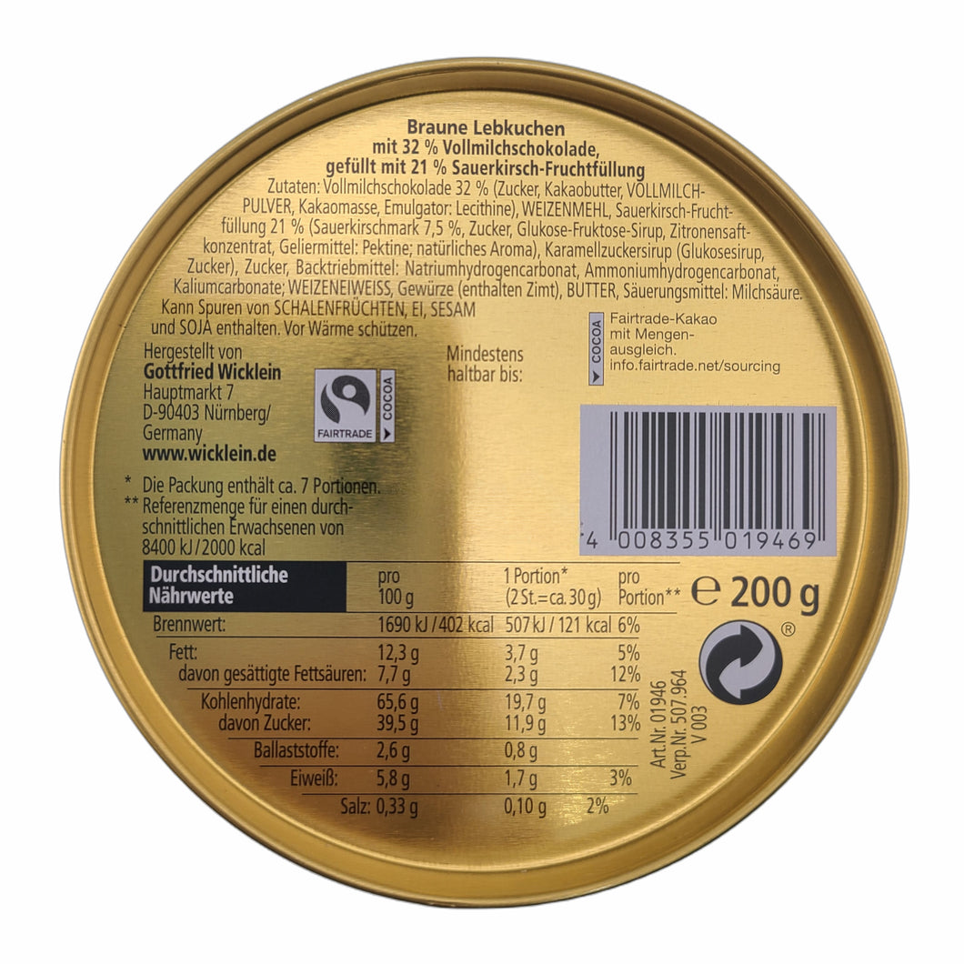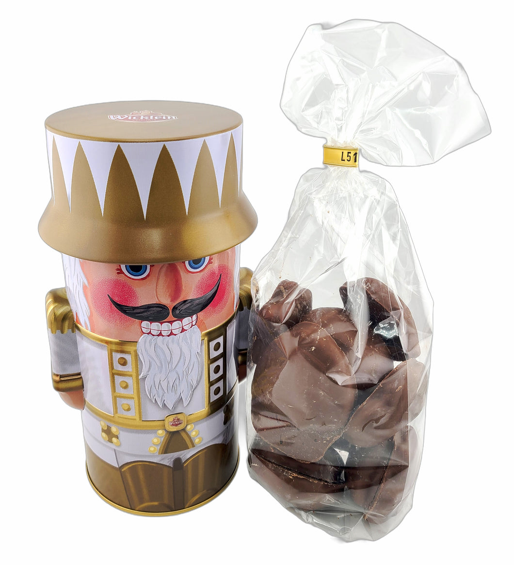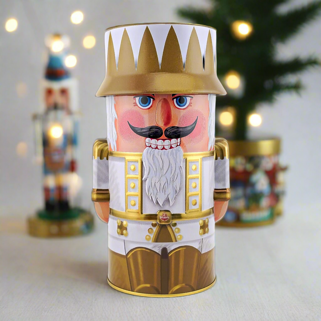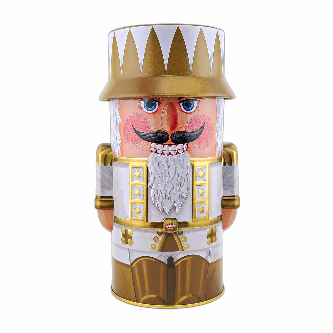 Celebrate your holidays with this charming Nutcracker Tin. The tin is filled with Wicklein's delicious mini milk chocolate lebkuchens gingerbread cookies with sour cherry fruit filling. It is an ideal gift for the holidays, perfect for young and old. The exquisite tin is collectible.