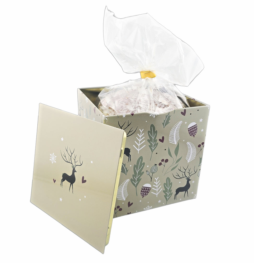 Wicklein original Nurnberger Gingerbread Oblaten-Lebkuchens Assorted in a holiday gift tin. This modern, elegant, and beautifully designed gift tin is filled with a gift bag of fine Wicklein gingerbread oblaten-lebkuchens, 2 assorted kinds, Glazed and Chocolate,2 pieces of each. These are large-sized lebkuchens, approximately 4" in diameter. The tin is collectible and perfect for keepsakes. Wicklein Lebkuchen gingerbread cookies are a flavorful treat that will complete your holidays. A perfect gift!